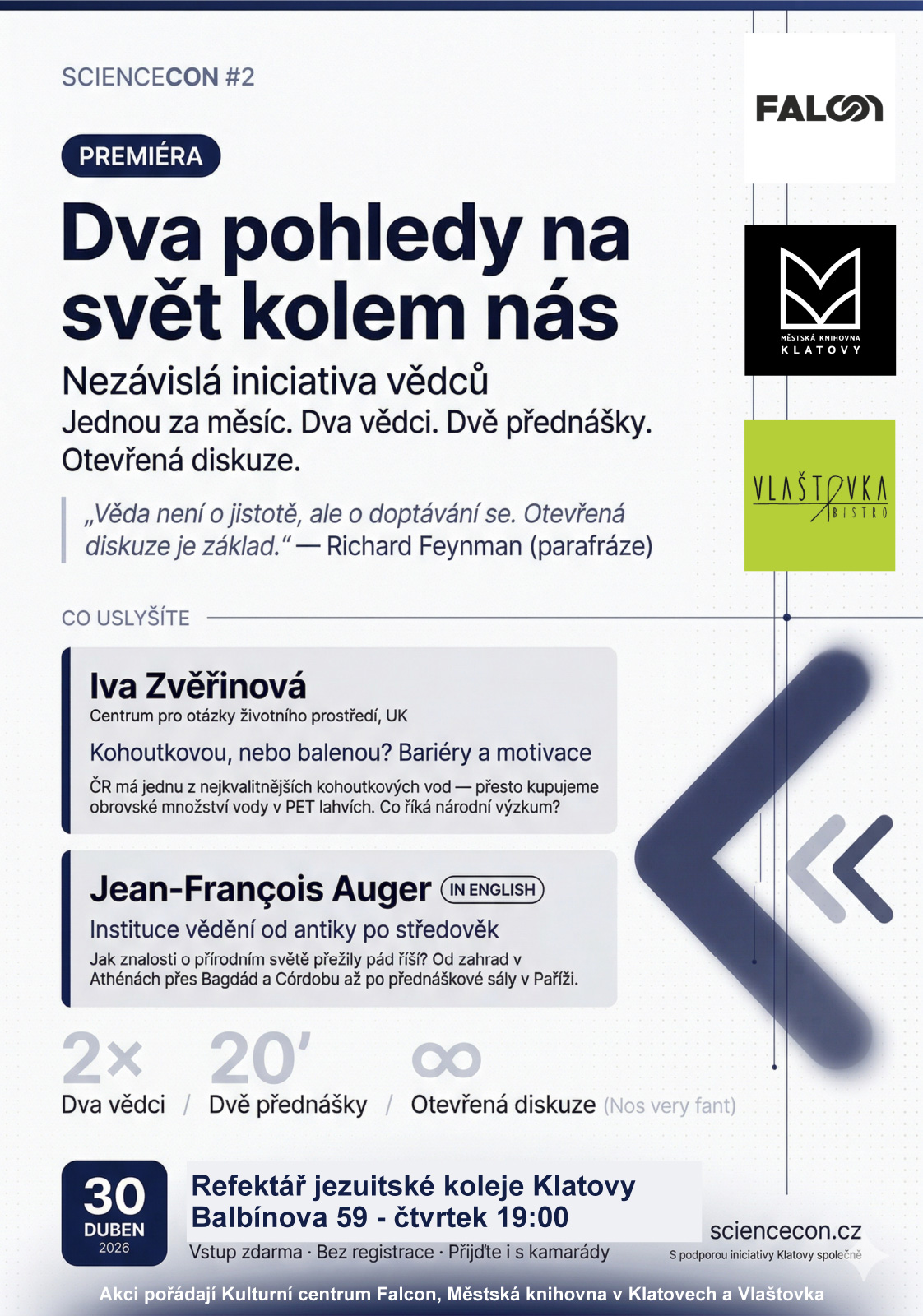 Dva vědci. Dvě dvacetiminutové přednášky. Otevřená diskuze.
